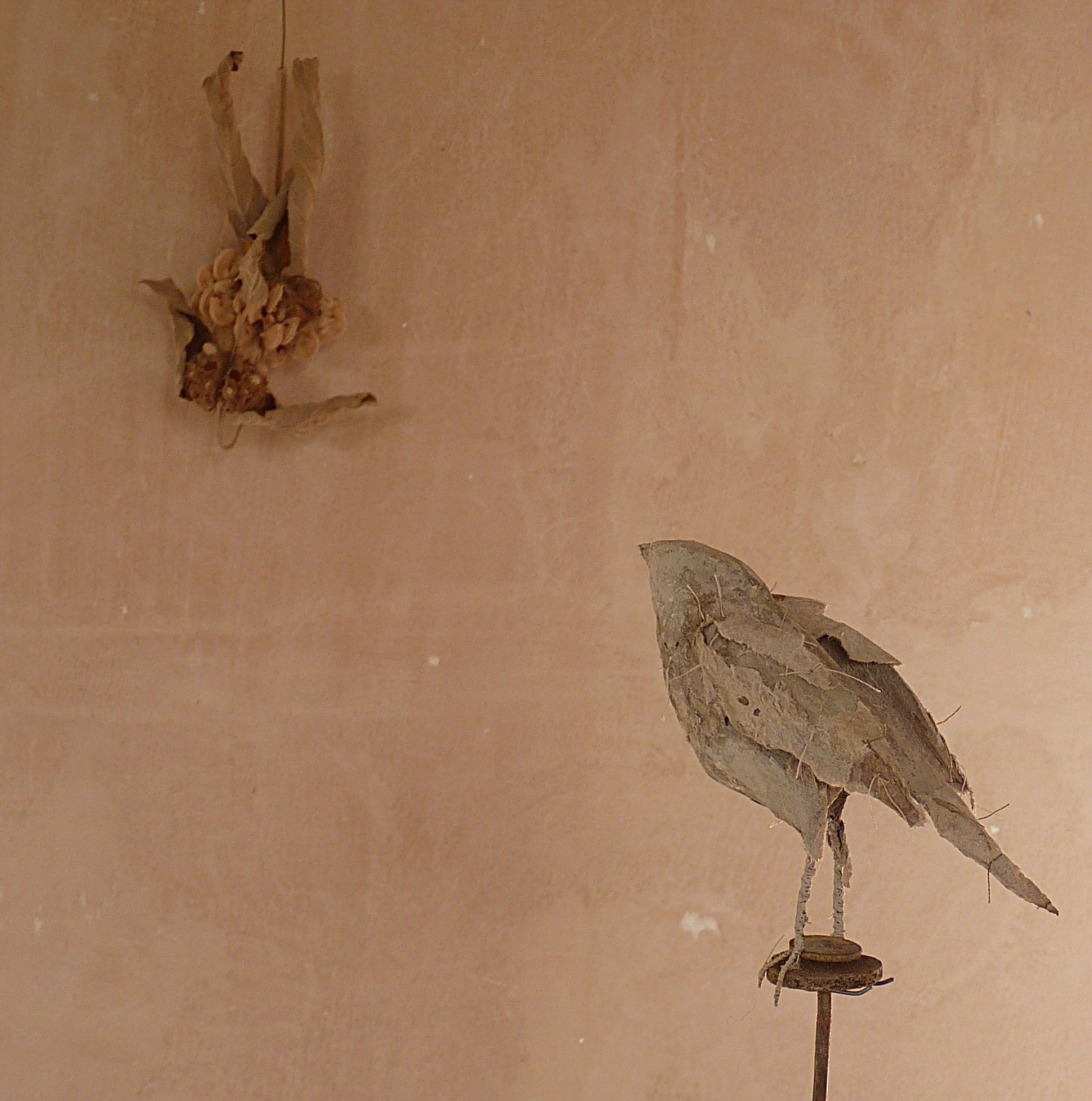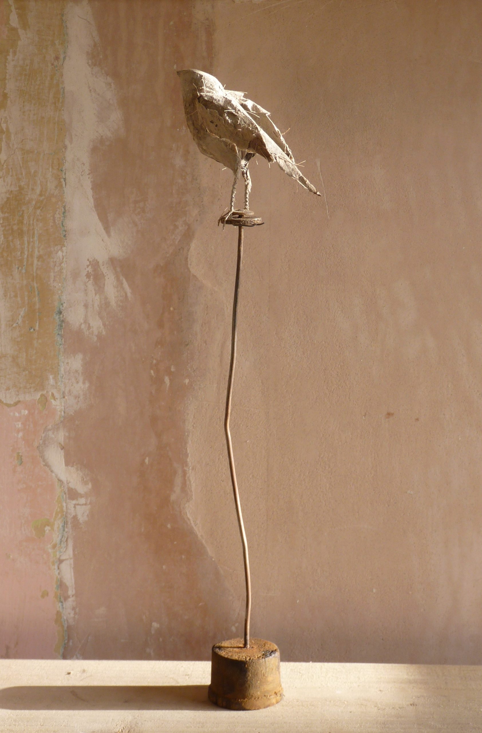 Mixed media bird made from wire, paper, clay and thread with wood and metal base