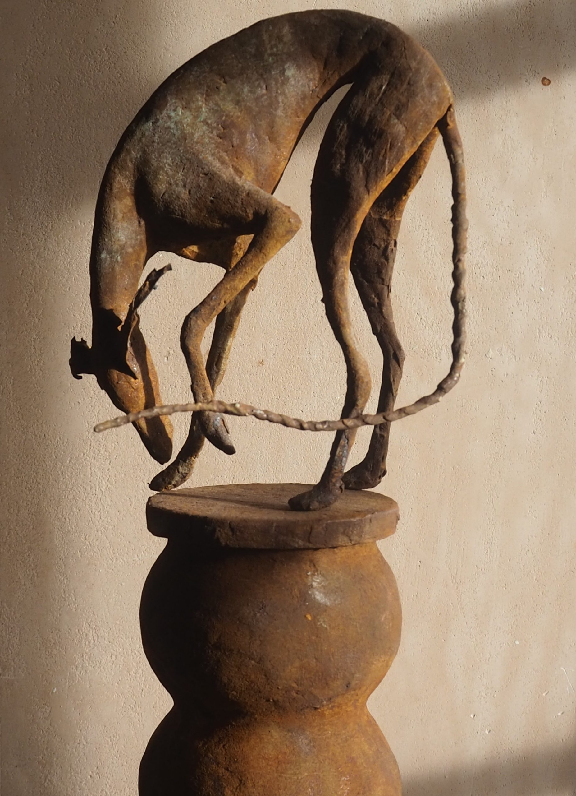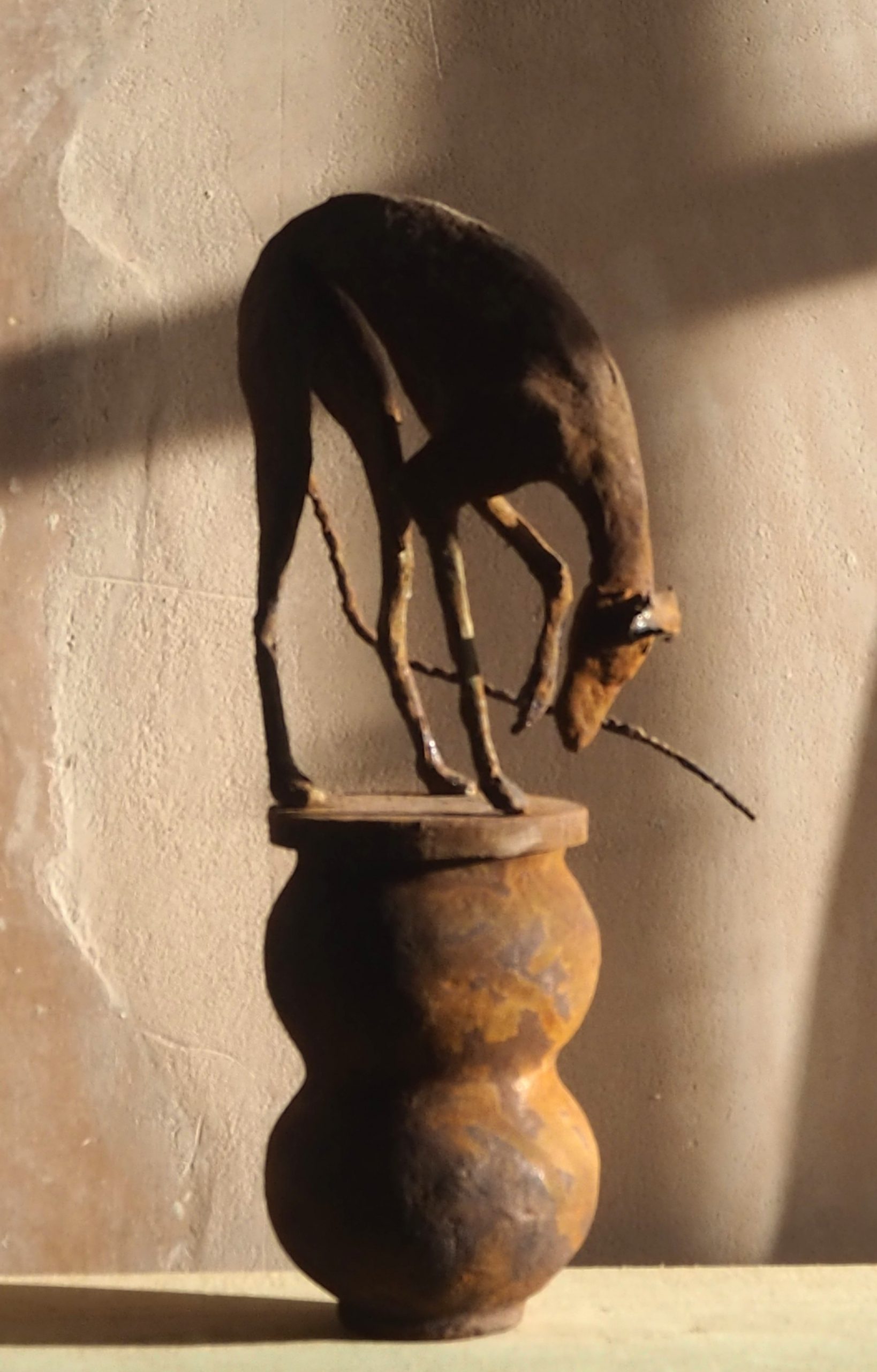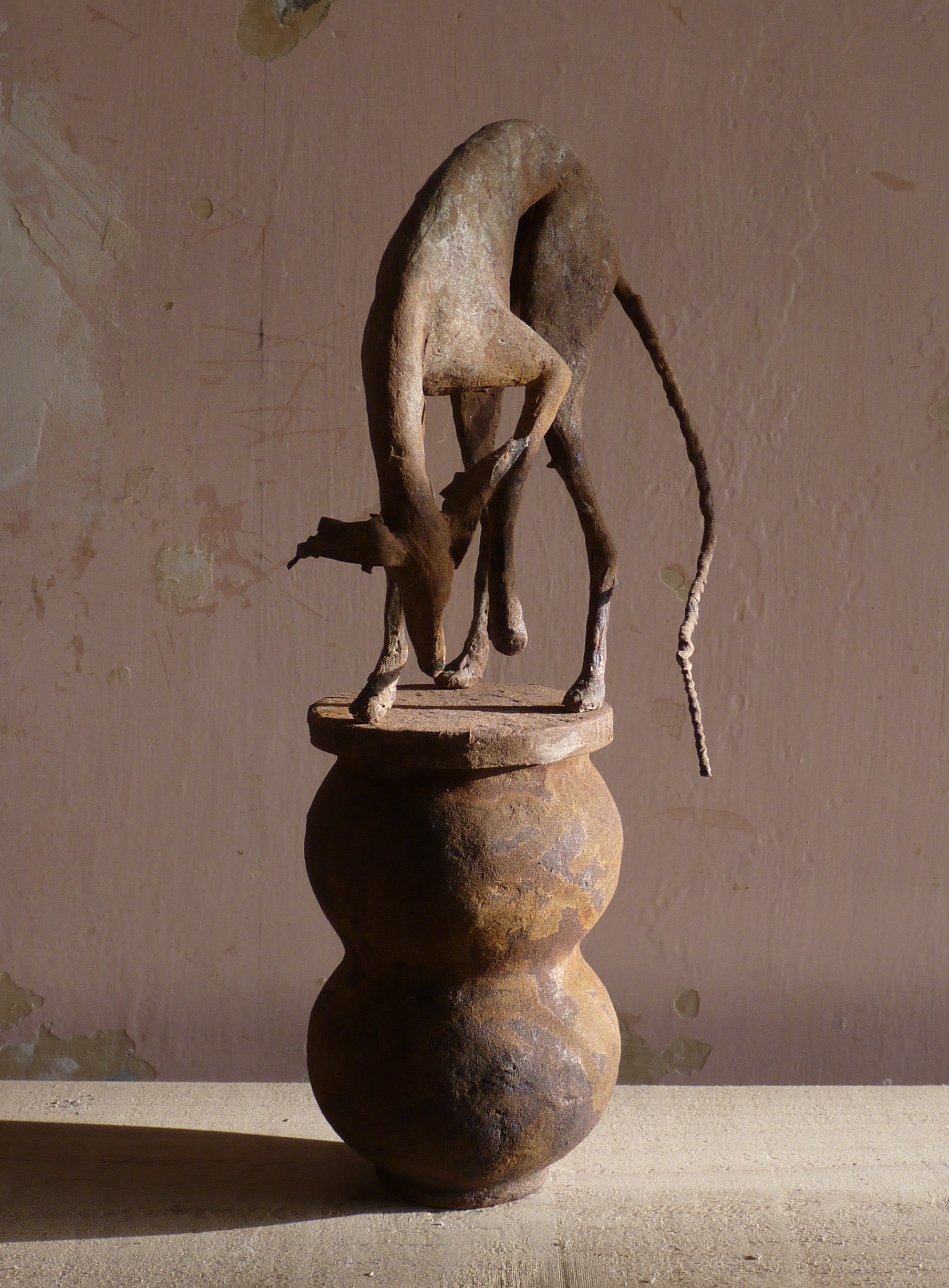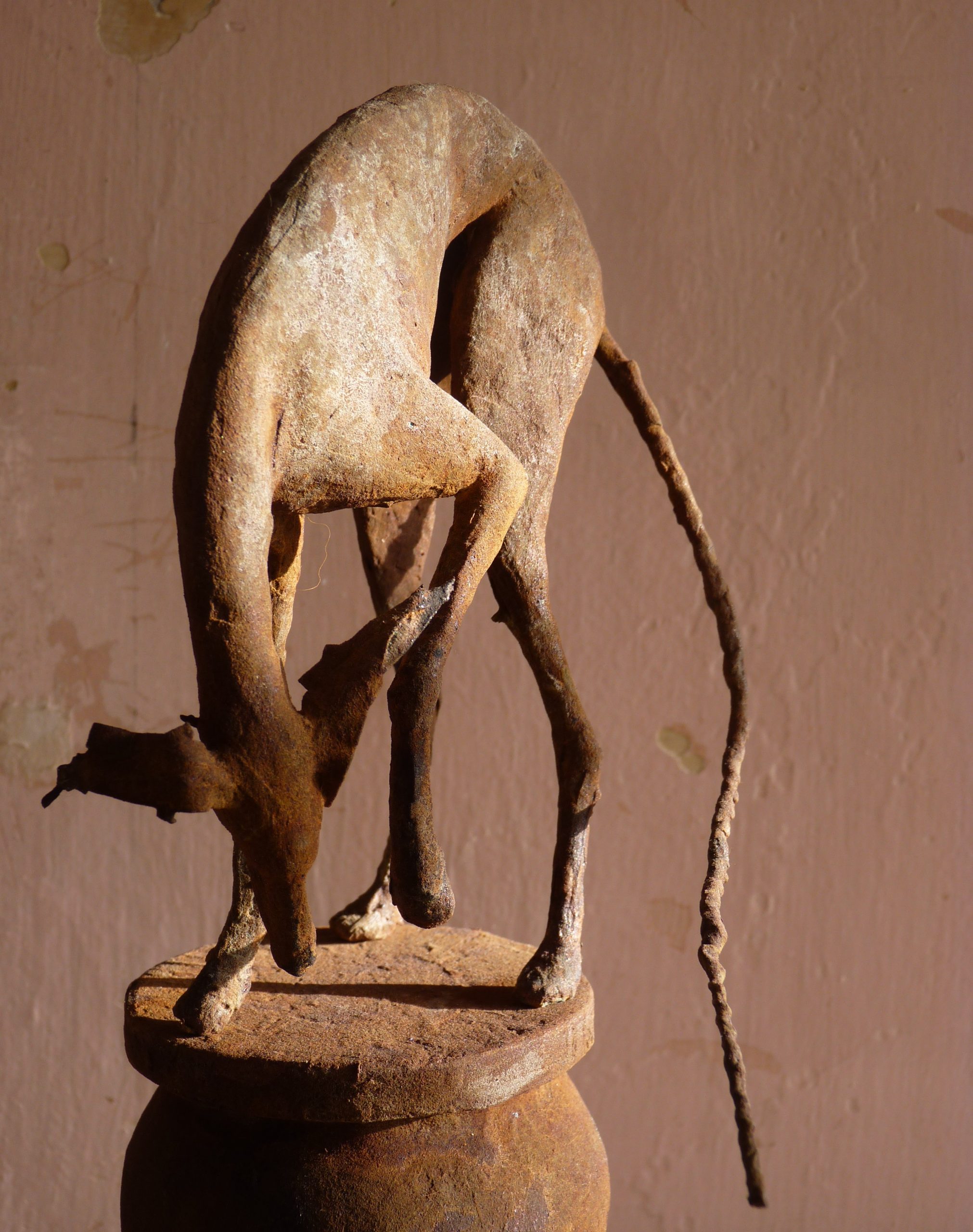 Mixed media maquette made from wire, paper and clay on a papier mache pot base.